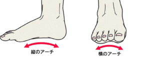 足には元々の機能として、土踏まず(縦アーチ)と、正面から見た時に少し丘のように指がドーム型(横アーチ)の構造をしています。