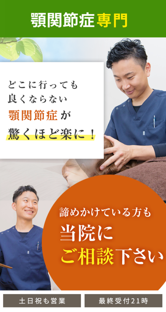 最初は腰痛を見てもらいに行ったのですが、全身の施術が対応できるということで顎関節症も見てもらいました。