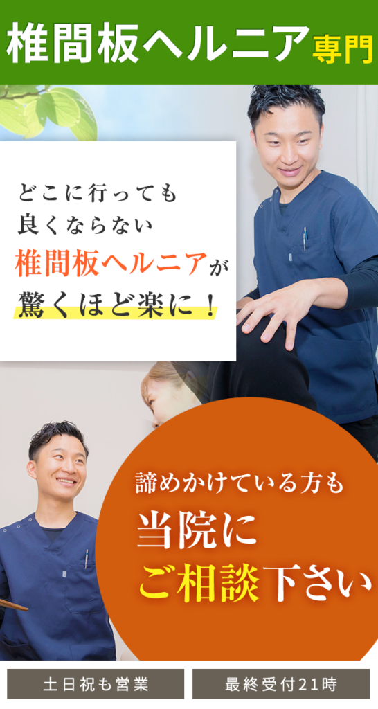 椎間板ヘルニアとは、背骨と背骨の間にクッションの役割を担っている椎間板が、仕事の過負荷や姿勢の悪さによって飛び出して神経を刺激している状態です。