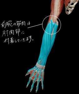手首や指を動かす筋肉や腱は肘に付着しています。
