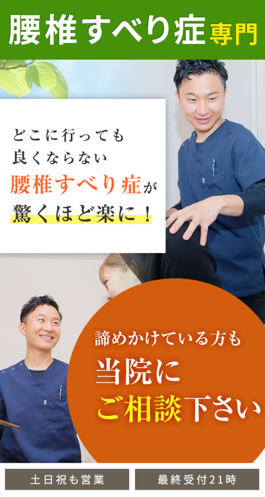 もし、あなたがどこへ行っても腰椎すべり症の症状である、腰の痛みや足の痺れが改善せず、お仕事に支障を来たし、趣味を楽しめなくなっているのであれば、是非とも当院へご相談ください。